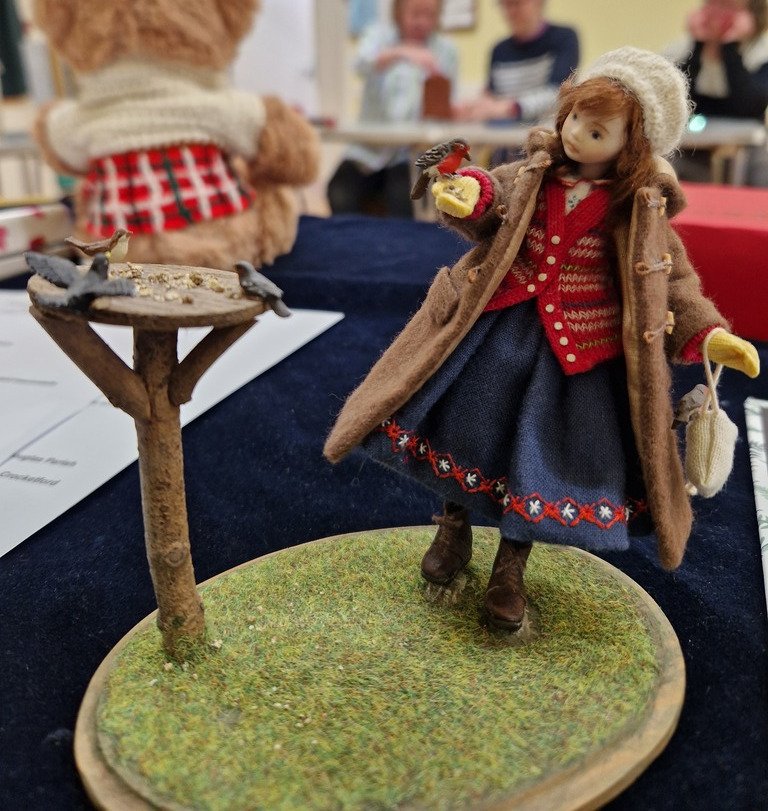 Alison explained how she accessed items and parts for her builds and contents from across the globe with the USA being a key source. The set of skills Alison accrued grew exponentially as she looked into different ways to bring a vast range of settings and people to life. She led classes on how to make, paint and clothe porcelain dolls among other themes. Members were spellbound as Alison passed round examples of her work. Torches and magnifying glasses were put to use to examine the detail of buildings, rooms, furniture and dolls covering many different settings. Being able to examine these closely made the experience more immersive for members. Helen gave Alison a vote of thanks which was heartily endorsed by everyone. Time had been suspended and members had stepped into a different world. Refreshments were then provided by Janice Gordon and Helen Grunshaw.